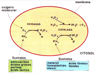 La peroxidasa utilitza oxigen molecular per a oxidar diversos tipus de substrats desprenent peròxid d'hidrogen (H2O2), substància que és tòxica per a la cèl·lula. Després actua la catalasa, que descompon el peròxid d'hidrogen.Així, poden oxidar àcids grassos i aminoàcids, aportant energia per a la cèl·lula, a més de detoxificar una gran varietat de molècules tòxiques, sobretot en el fetge i en el ronyó.